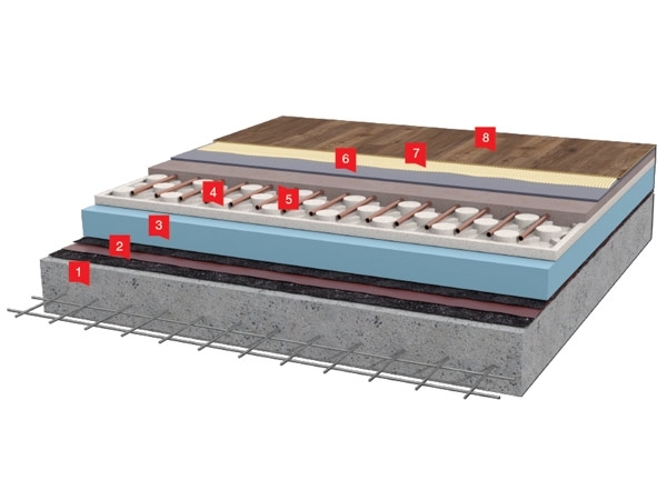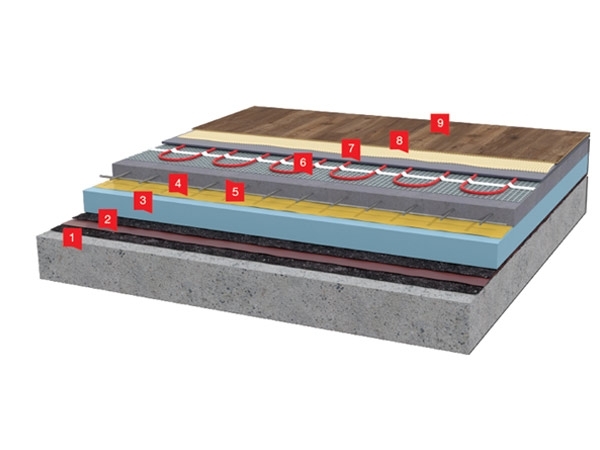 flexibilního lepidla pro obklady a dlažby. Poté se rohož zalévá vrstvou kvalitní rozlévací stěrkové hmoty o tloušťce odpovídající dvojnásobku průměru topného drátu.